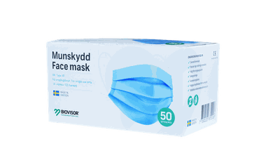 Svensktillverkat kirurgiskt munskydd typ IIR med elastiska öronband. Munskyddet har en bakteriell filtrationskapacitet på 99,9%, vilket är högre än kravet, 98%, för typ IIR munskydd. Munskydden är testade på ett oberoende svenskt laboratorium (RISE), CE-märkta och godkända enligt standard EN 14683:2019.