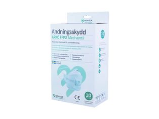 Svensktillverkat andningsskydd FFP2 med elastiska huvudband och ventil.